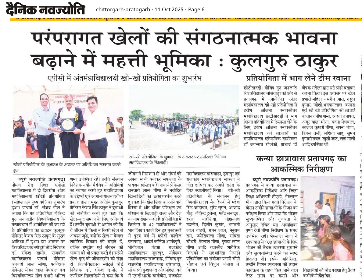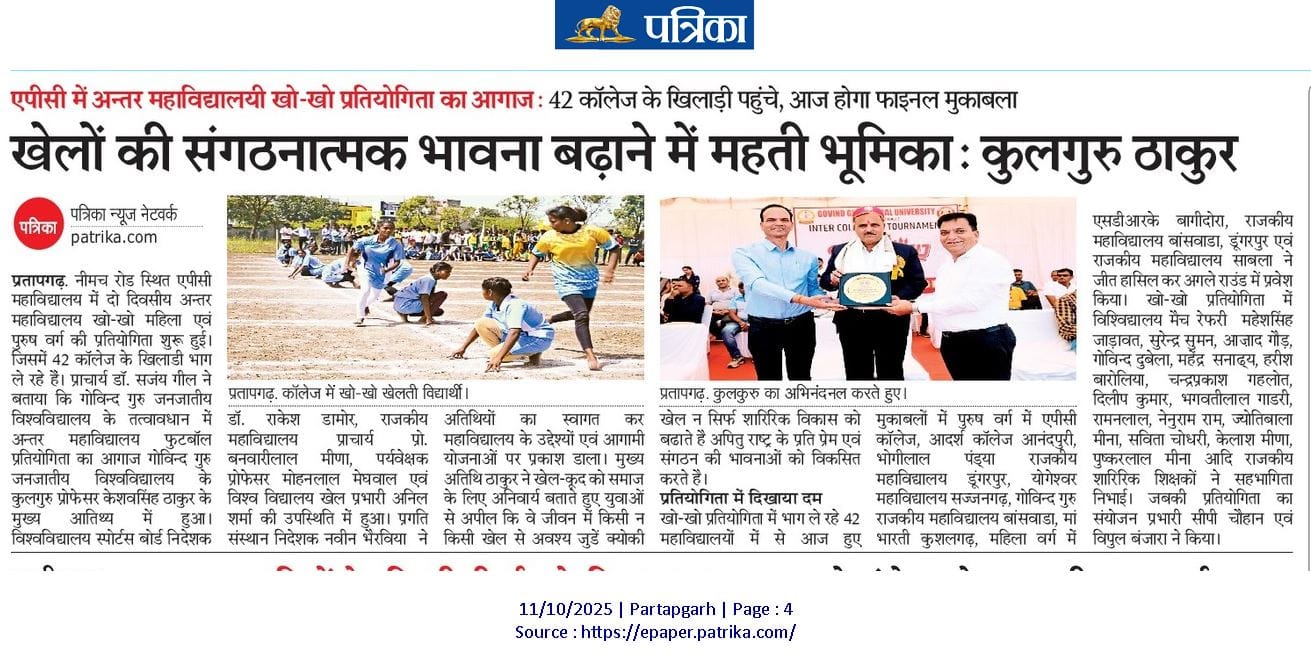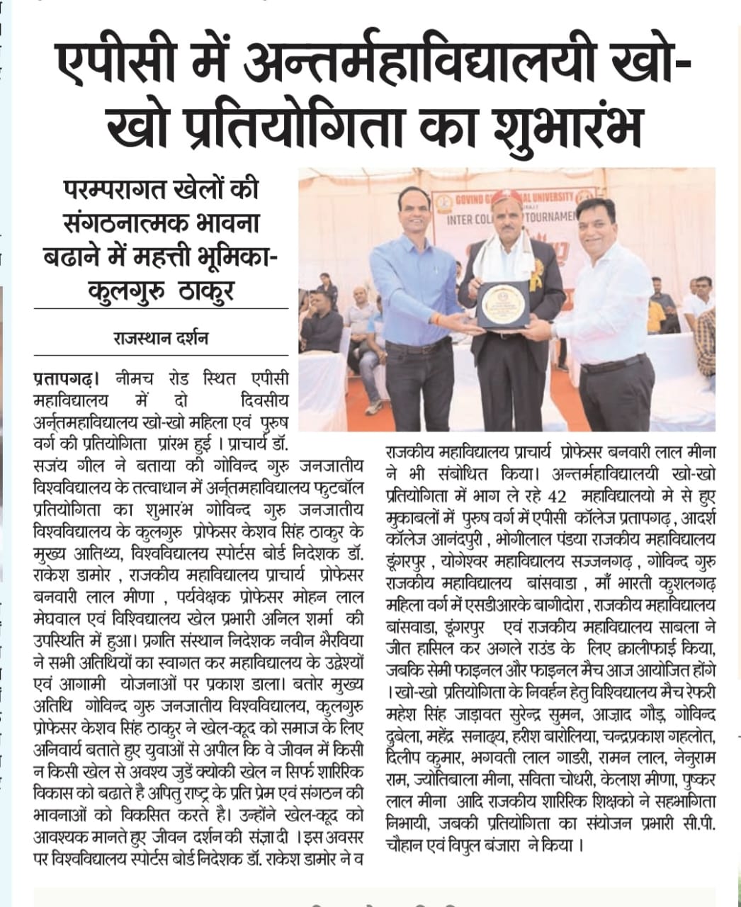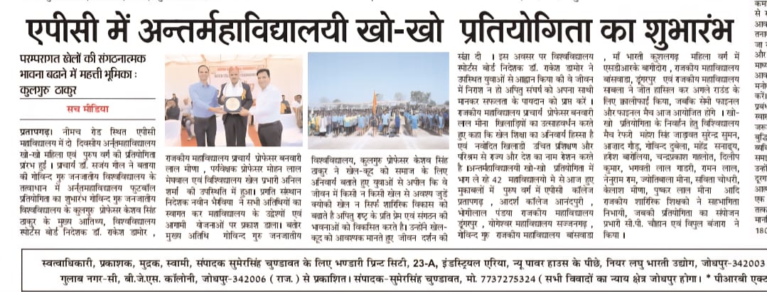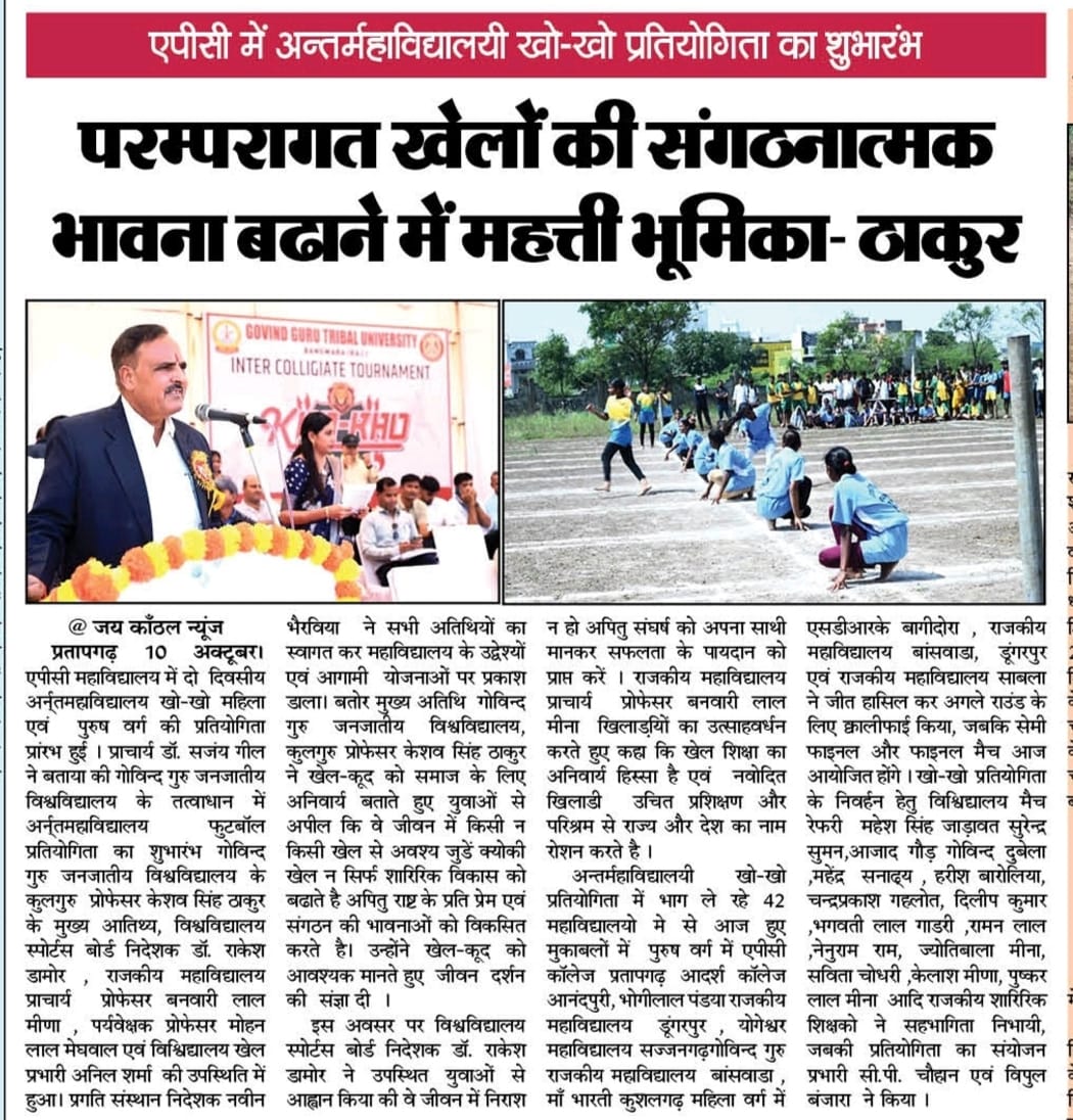 प्रतापगढ़ 10 अक्टूबर। एपीसी महाविद्यालय में दो दिवसीय अन्तमह्मविद्यालय खो-खो महिला एवं पुरुष वर्ग की प्रतियोगिता प्रांरभ हुई । प्राचार्य डॉ. सजंय गील ने बताया की गोविन्द गुरु जनजातीय विश्वविद्यालय के तत्वाधान में अन्तमहाविद्यालय फुटबॉल प्रतियोगिता का शुभारंभ गोविन्द गुरु जनजातीय विश्वविद्यालय के कुलगुरु प्रोफेसर केशव सिंह ठाकुर के मुख्य आतिथ्य, विश्वविद्यालय स्पोर्टस बोर्ड निदेशक डॉ. राकेश डामोर, राजकीय महाविद्यालय प्राचार्य प्रोफेसर बनवारी लाल मीणा, पर्यवेक्षक प्रोफेसर मोहन लाल मेघवाल एवं विश्विद्यालय खेल प्रभारी अनिल शर्मा की उपस्थिति में हुआ। प्रगति संस्थान निदेशक नवीन भैरविया ने सभी अतिथियों का स्वागत कर महाविद्यालय के उद्देश्यों एवं आगामी योजनाओं पर प्रकाश डाला। बतोर मुख्य अतिथि गोविन्द गुरु जनजातीय विश्वविद्यालय, कुलगुरु प्रोफेसर केशव सिंह ठाकुर ने खेल-कूद को समाज के लिए अनिवार्य बताते हुए युवाओं से अपील कि वे जीवन में किसी न किसी खेल से अवश्य जुडें क्योकी खेल न सिर्फ शारिरिक विकास को बढाते है अपितु राष्ट के प्रति प्रेम एवं संगठन की भावनाओं को विकसित करते है। उन्होंने खेल-कूद को आवश्यक मानते हुए जीवन दर्शन की संज्ञा दी । इस अवसर पर विश्वविद्यालय स्पोर्टस बोर्ड निदेशक डॉ. राकेश डामोर ने उपस्थित युवाओं से आह्वान किया की वे जीवन में निराश न हो अपितु संघर्ष को अपना साथी मानकर सफलता के पायदान को प्राप्त करें। राजकीय महाविद्यालय प्राचार्य प्रोफेसर बनवारी लाल मीना खिलाड़‌यिों का उत्साहवर्धन करते हुए कहा कि खेल शिक्षा का अनिवार्य हिस्सा है एवं नवोदित खिलाडी उचित प्रशिक्षण और परिश्रम से राज्य और देश का नाम रोशन करते है। अन्तर्महाविद्यालयी खो-खो प्रतियोगिता में भाग ले रहे 42 महाविद्यालयो मे से आज हुए मुकाबलों में पुरुष वर्ग में एपीसी कॉलेज प्रतापगढ़ आदर्श कॉलेज आनंदपुरी, भोगीलाल पंडया राजकीय महाविद्यालय डूंगरपुर, योगेश्वर महाविद्यालय सज्जनगढ़गोविन्द गुरु राजकीय महाविद्यालय बांसवाडा, माँ भारती कुशलगढ़ महिला वर्ग में एसडीआरके बागीदोरा, राजकीय महाविद्यालय बांसवाडा, डूंगरपुर एवं राजकीय महाविद्यालय साबला ने जीत हासिल कर अगले राउंड के लिए क्वालीफाई किया, जबकि सेमी फाइनल और फाइनल मैच आज आयोजित होंगे। खो-खो प्रतियोगिता के निवर्हन हेतु विश्विद्यालय मैच रेफरी महेश सिंह जाड़ावत सुरेन्द्र सुमन, आजाद गौड़ गोविन्द दुबेला महेंद्र सनाढ्य, हरीश बारोलिया, चन्द्रप्रकाश गहलोत, दिलीप कुमार भगवती लाल गाडरी, रामन लाल नेनुराम राम, ज्योतिबाला मीना, सविता चोधरी, केलाश मीणा, पुष्कर लाल मीना आदि राजकीय शारिरिक शिक्षको ने सहभागिता निभायी, जबकी प्रतियोगित