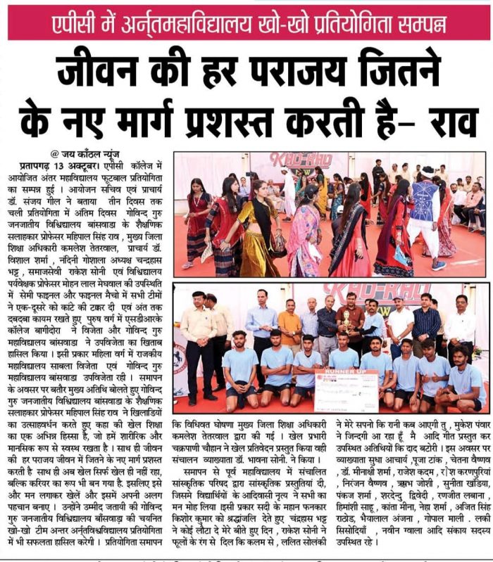 प्रतापगढ़ 10 अक्टूबर। एपीसी महाविद्यालय में दो दिवसीय अन्तमह्मविद्यालय खो-खो महिला एवं पुरुष वर्ग की प्रतियोगिता प्रांरभ हुई । प्राचार्य